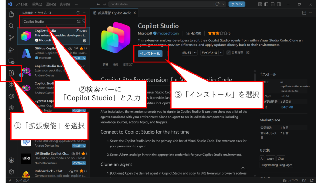 - インストール完了後左側サイドバーの「Copilot Studio」を選択します。