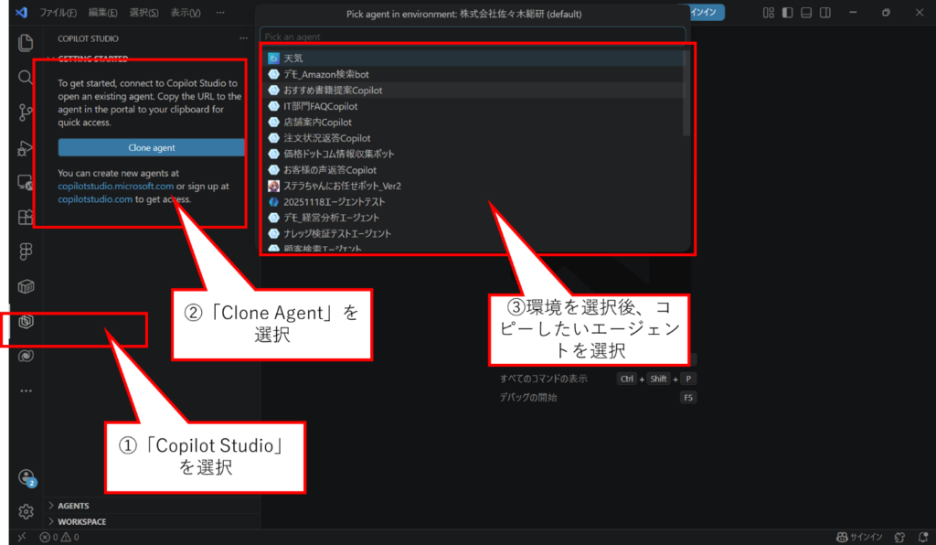 この操作により、Copilot Studio のエージェントをローカル環境にコピーできます。 - 環境を選択後コピーしたいエージェントを選択し、任意のフォルダに保存します。