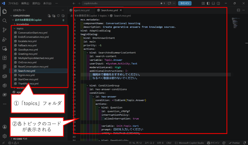 ダウンロードが完了すると、エージェントを構成するフォルダやファイルが VS Code 上に表示されます。トピックを編集したい場合は、「topics」フォルダを選択します。すると、トピックごとのファイル一覧が表示されるため、任意のファイルを開いて編集できます。