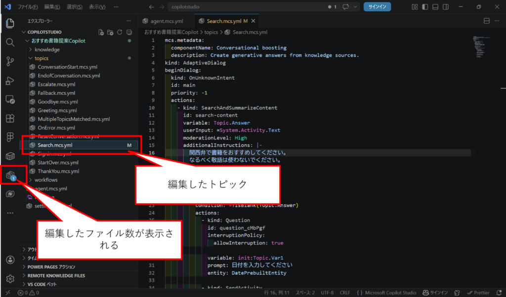 トピックを編集したファイルには「M」のマークがつき、左側の「Copilot Studio」のアイコンには編集したファイル数が表示されます。