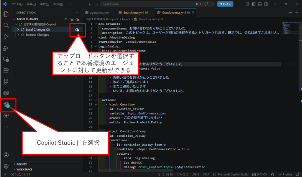 編集後は、左側の「Copilot Studio」を選択し、「AGENT CHANGES」-「Local Changes」のアップロードアイコンをクリックすると、本番環境のエージェントにトピックの更新内容を反映できます。