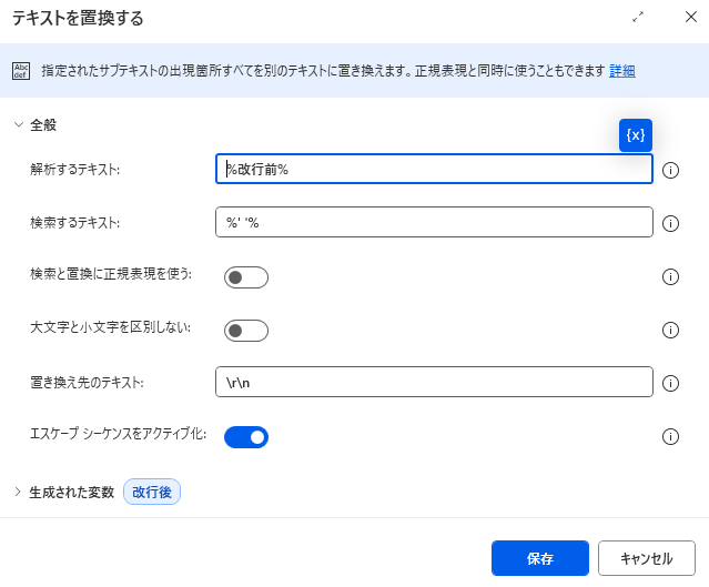 置き換え先のテキスト:\r\n(改行コードを表しています。変数の設定アクションなどで記述した場合は改行コードとして認識されません。)