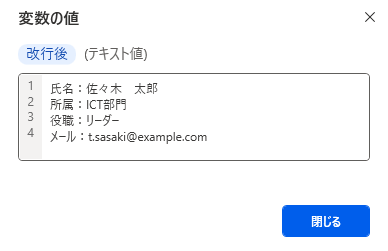 「氏名:佐々木 太郎△所属:ICT部門△役職:リーダー△メール:t.sasaki@example.com」